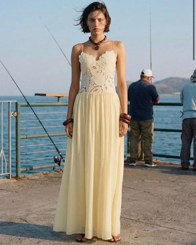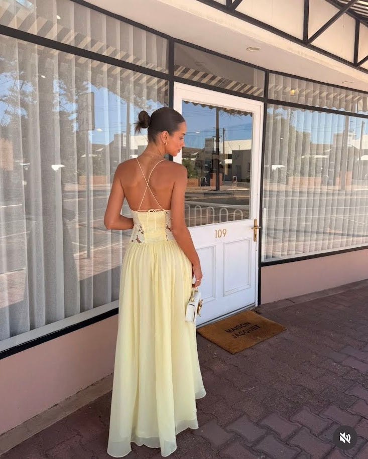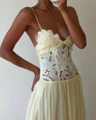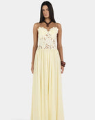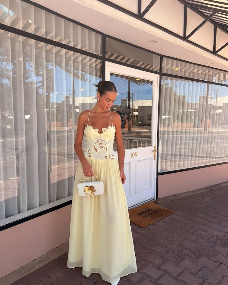 The Stephanie Maxi Dress is a maxi length dress with a sheer lace waist detailing and lined bust cups that falls into a gathered, full skirt. The dress has roleau straps with length extension for the perfect fit. The Stephanie is the perfect piece for your next special event.