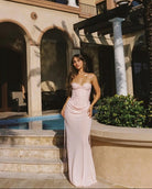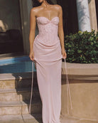 Strapless corseted bodysuit. Curved bustline shaping. Gather detail at centre bust. Shaping bodice lines with corset boning. Lace up eyelet fastening. Fixed undergarment with pop stud closure. Bias cut georgette. Full length skirt silhouette. French seams. Waistline draping across front and back