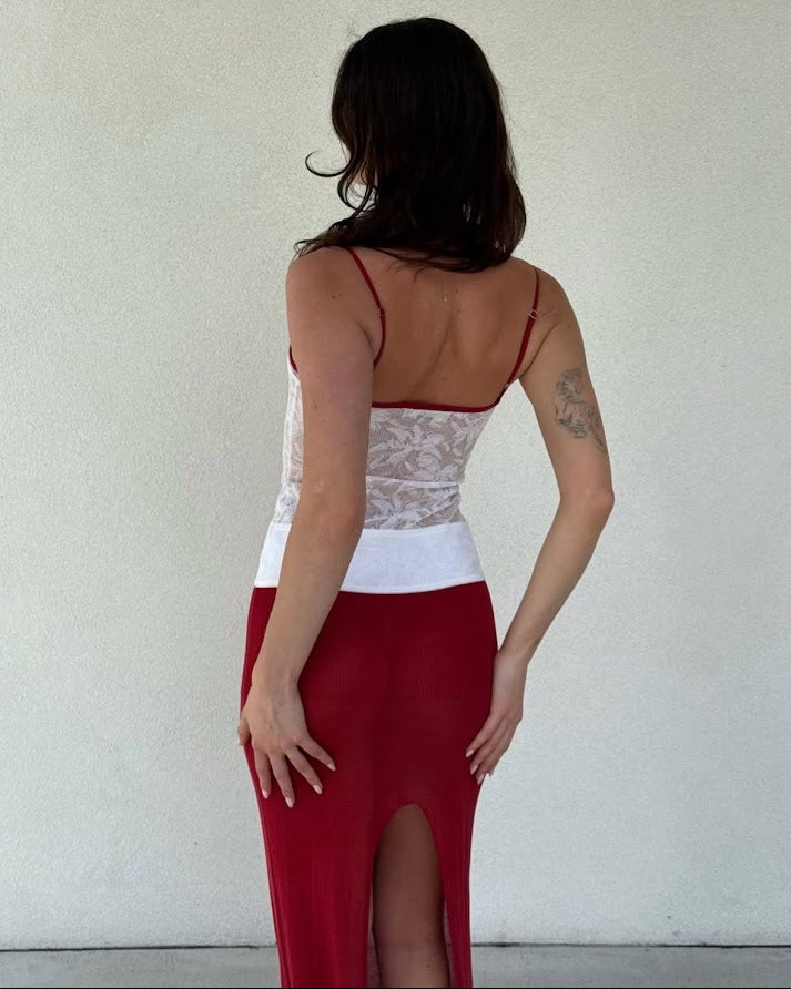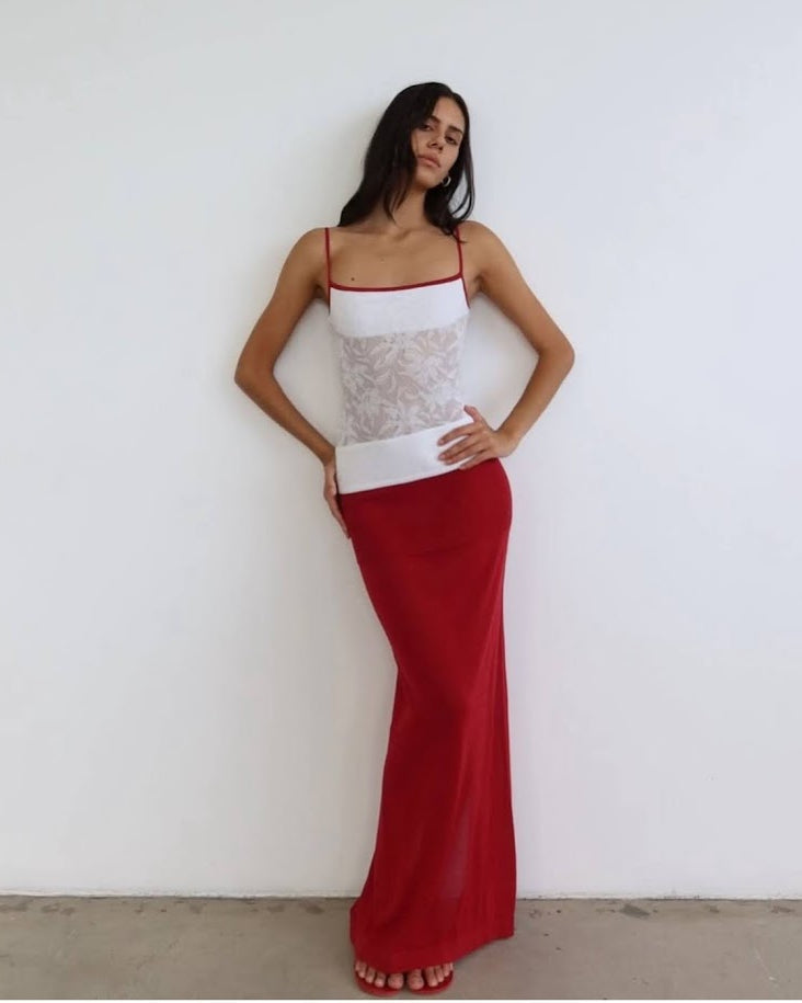 The Alfie Knit Maxi Dress features a straight neckline with adjustable spaghetti straps and a floor-length silhouette. Knitted in a lightweight, stretch cotton nylon yarn with organza foral motifs. It combines block-panelled knit with a delicate lace bodice and includes a back split for added movement. True knit garment that hugs the body. Straight neckline with adjustable straps with bra extenders. Pull on design. Added bust panel lining for coverage. Back hem split. Maxi length. Total length from front neckline to hem is 135.5cm.