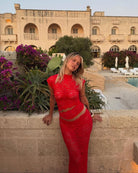 Garment is see-through lace, comes with a red mini skirt that can be worn underneath.
