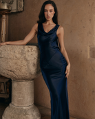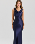 Safaira Blue Satin Draped Cowl Neck Maxi Dress | Navy